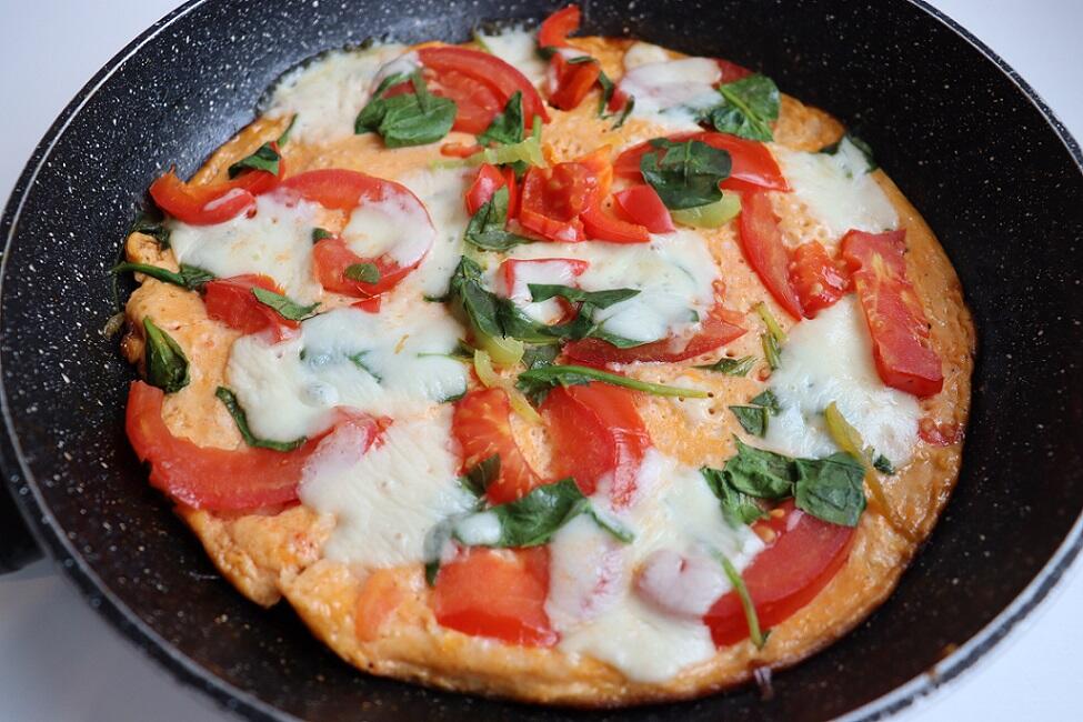 - Hozzáadjuk a felszeletelt paradicsomot és a sajtot, ízlés szerint néhány spenótlevelet és kaliforniai paprikát, majd 5-8 percig lefedve, kis lángon tovább pároljuk (figyelve, hogy ne égjen le).